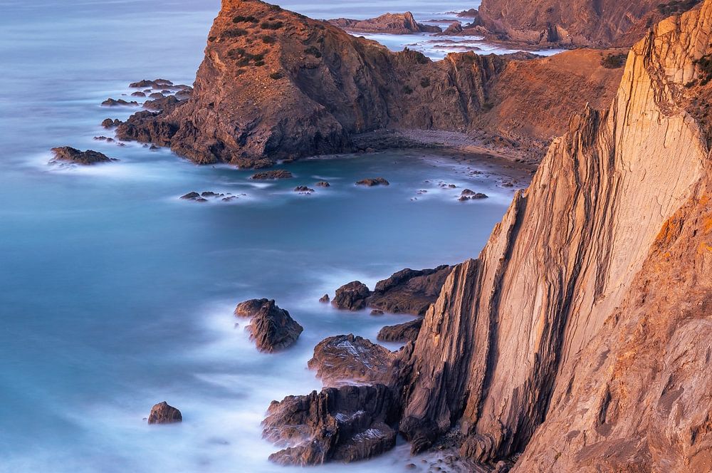 Dieses Foto wurde an der Westküste der südportugiesischen Algarve aufgenommen. Die Südküste ist eher als Touristenattraktion bekannt, aber die Westküste mit ihren tosenden Wellen des Atlantiks hat auch viele spektakuläre Felsen und Klippen zu bieten. Hier sehen wir Praia Arrifana, einen Küstenabschnitt in der Nähe der Stadt Aljezur.