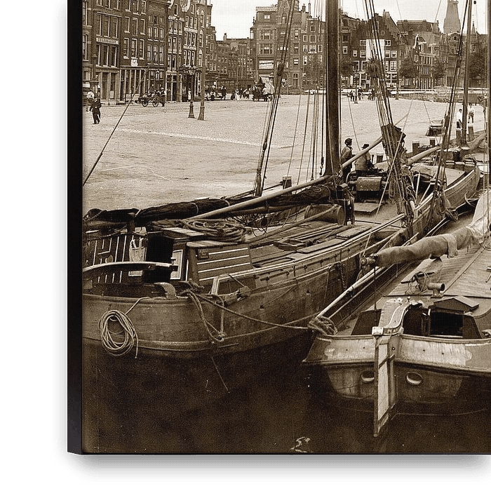Een oude, bewerkte foto van de Prins Hendrikkade in Amsterdam. Origineel van George Henrik Breitner, Stads Archief Amsterdam. Voorop liggen 3 oude zeilschepen aan de kade met op de achtergrond zicht op Amsterdamse huizen en rondlopende mensen. Zwart wit foto.