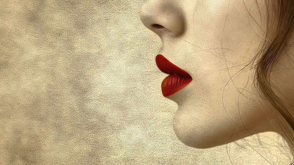 Dieses Bild zeigt das seitliche Profil einer schönen jungen Frau, die roten Lippenstift trägt und vor einem rauen, grungeartigen Hintergrund posiert. Der starke Kontrast zwischen ihrer makellosen Haut und den lebhaft roten Lippen verstärkt die sinnliche Wirkung des Porträts. Der Grunge-Hintergrund, der durch seine texturierte und leicht verwitterte Optik besticht, hebt die Eleganz und Raffinesse der Frau noch mehr hervor. Ihre Pose ist ruhig und dennoch selbstbewusst, wodurch das Bild eine spannende Spannung zwischen modernem Stil und künstlerischem Ausdruck vermittelt. Diese Komposition zelebriert zeitlose Schönheit in einem rohen, urbanen Umfeld.