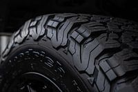 Die grobe Profilierung eines Reifens unter einem robusten Jeep.