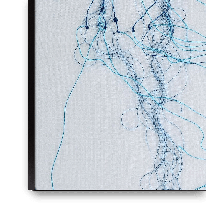 Ein figuratives Werk aus blauem Garn auf Leinwand. Ein Bild von einem zeeländischen Mädchen im Wasser. Die losen Fäden zeigen die Bewegung des Wassers, in diesem Bild wird echtes Wasser verwendet, um dem Bild noch mehr Bewegung zu geben.