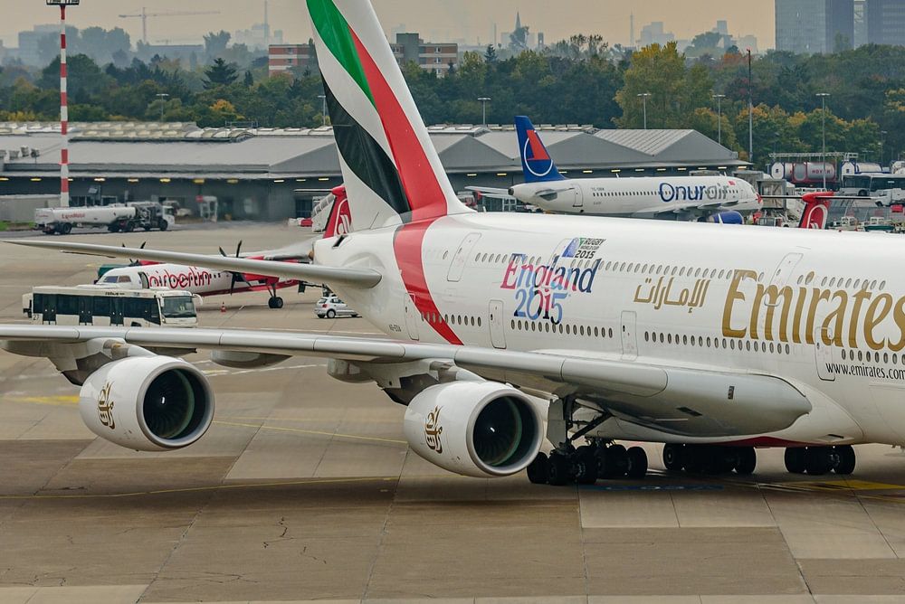 Ein Emirates Airbus A380 (A6-EOA) hat am Flughafen Düsseldorf einen Pushback für den Abflug nach Dubai erhalten. Das Flugzeug hat einen Aufkleber auf dem Rumpf, der für die Rugby-Weltmeisterschaft 2015 in England wirbt.