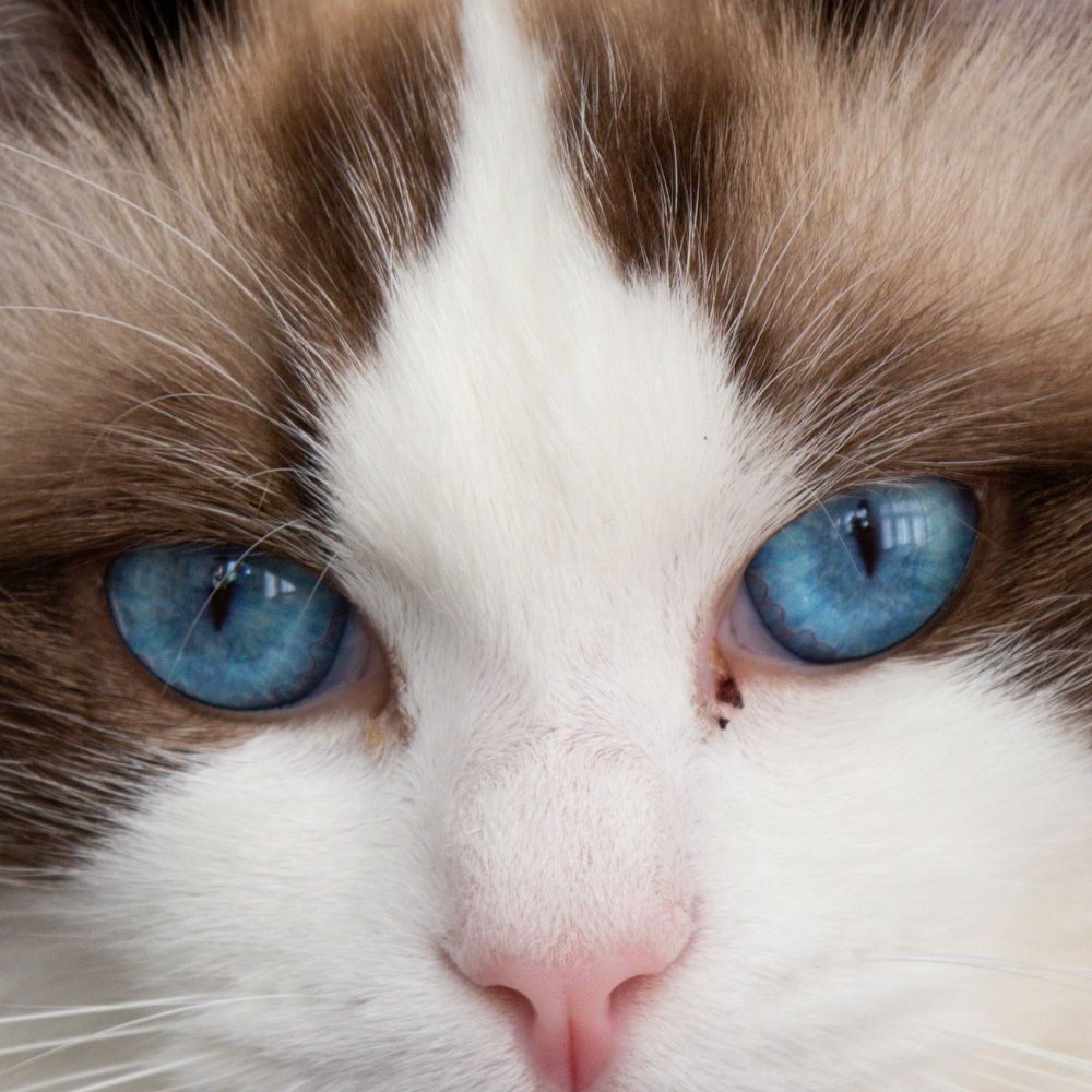 Mit strahlend blauen Augen posiert diese schöne Ragdoll-Katze für die Kamera.