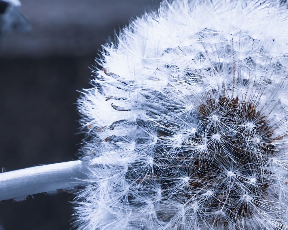 Pusteblume im Vordergrund und im Hintergrund geschlossene Löwenzahnblüten.