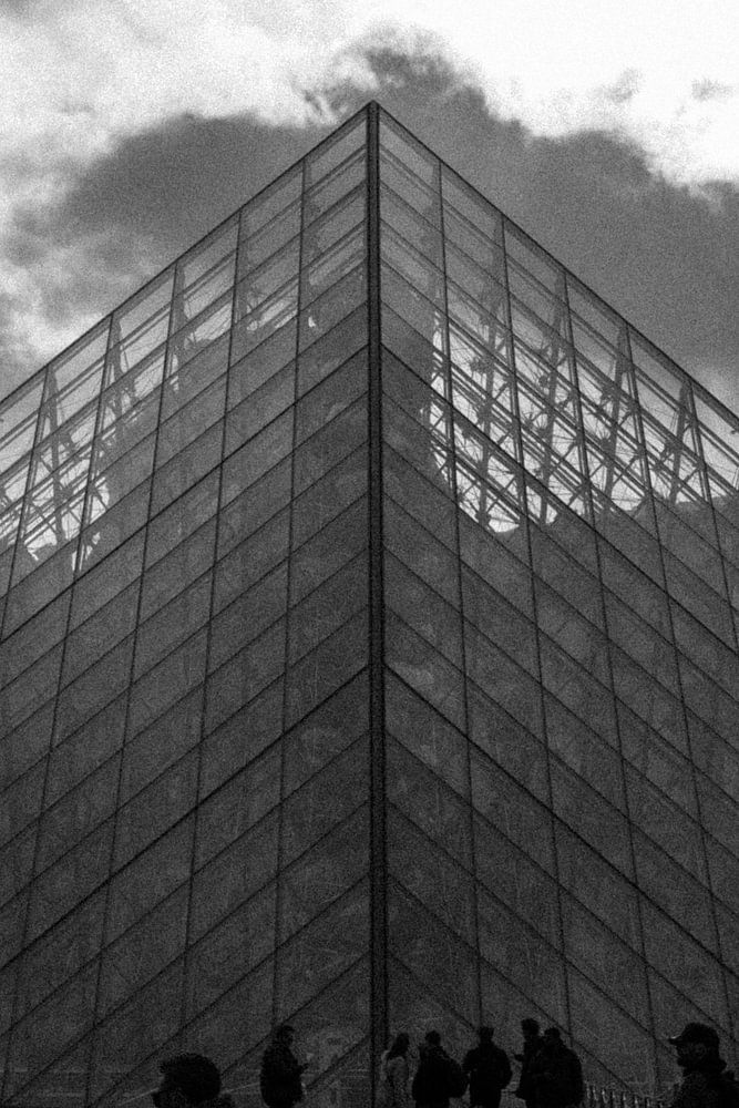 Pyramide des Louvre in Paris in schwarz-weiß.