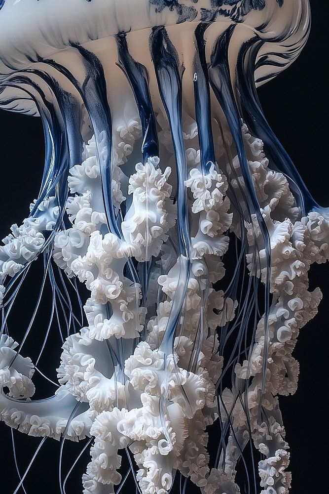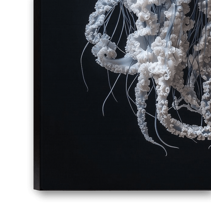 in kunstvolles Arrangement: Eine zarte Qualle schwebt anmutig vor einem eleganten Marmorhintergrund, umgeben von üppigen, sanft gefärbten Pfingstrosen (Peonies). Die Kombination der durchscheinenden Tentakel und der weichen, üppigen Blütenblätter verleiht dem Bild eine harmonische Balance aus Leichtigkeit und luxuriöser Schönheit, während der Marmorhintergrund für einen Hauch von zeitloser Eleganz sorgt.