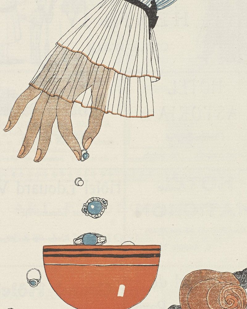Ein historischer Modedruck mit einem modernen Twist: "Quelques bagues". Inspiriert vom Art Deco, einer Stilrichtung, die in den 1920er Jahren entstand. Neuer geschäftsmäßiger Stil gemischt mit modernen klaren Linien und Farben.