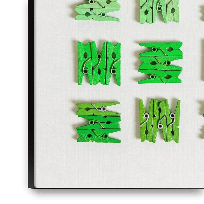 Diese farbigen Wäscheklammern wurden in 3er-Gruppen sortiert und dann in eine 5x5-Ebene auf weißem Hintergrund eingeteilt.