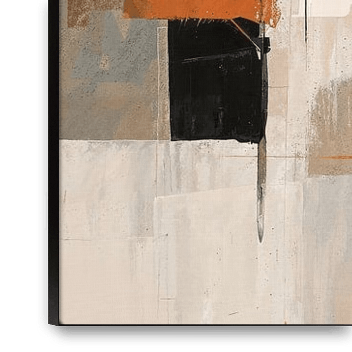 Calm Dynamics | Abstrakte Kunst - Dieses abstrakte Werk spielt mit einer Harmonie von Erdtönen, die von schwarzen Linien unterbrochen werden, die einen grafischen Kontrast bilden. Der Stil balanciert zwischen strukturiert und spontan, wobei sich Flächen und Streifen in einer Komposition treffen, die sowohl Ruhe als auch Dynamik…