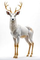 In anmutiger Ruhe steht das Reh im Zentrum der Komposition, seine Erscheinung geprägt von Leichtigkeit, Eleganz und natürlicher Harmonie. Sein schlanker Körper entfaltet sich in einer reinen, nahezu makellosen Weißheit, die jede Linie weich und zugleich präzise modelliert. Die fein geschwungenen, goldenen Geweihstrukturen erheben sich…