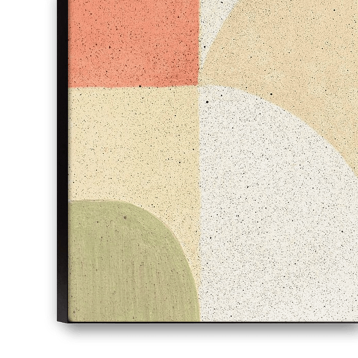 Die Komposition besteht aus einem Spiel von sich überlagernden Formen, die Tiefe und Bewegung suggerieren. Die gewellten Linien und subtilen Farbübergänge verstärken die Assoziation mit natürlichen Elementen wie Sanddünen, fließendem Wasser und weichen Horizontlinien. Das Werk spielt mit Kontrasten: zwischen warmen Erdnuancen und Pastelltönen sowie zwischen den organischen Formen und der stilisierten Schlichtheit des Designs.