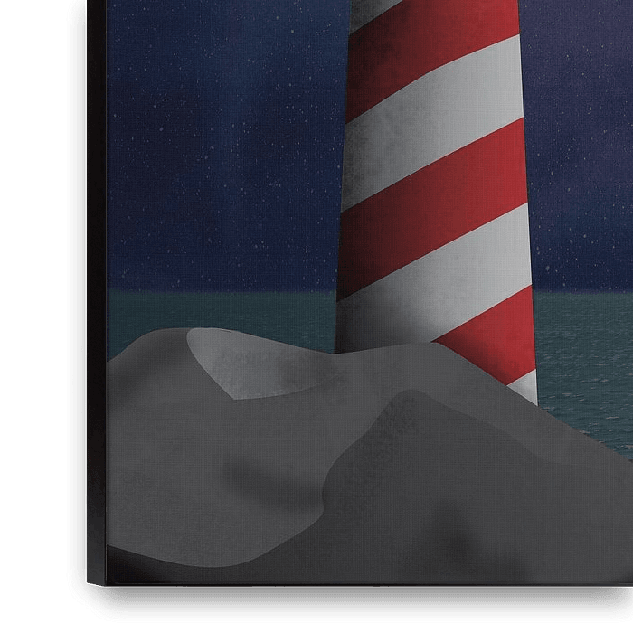 Eine digitale Illustration eines Leuchtturms. Sie sehen das Meer und einen felsigen Teil der Landschaft. Der Hintergrund ist ein Abendhimmel mit Sternen.