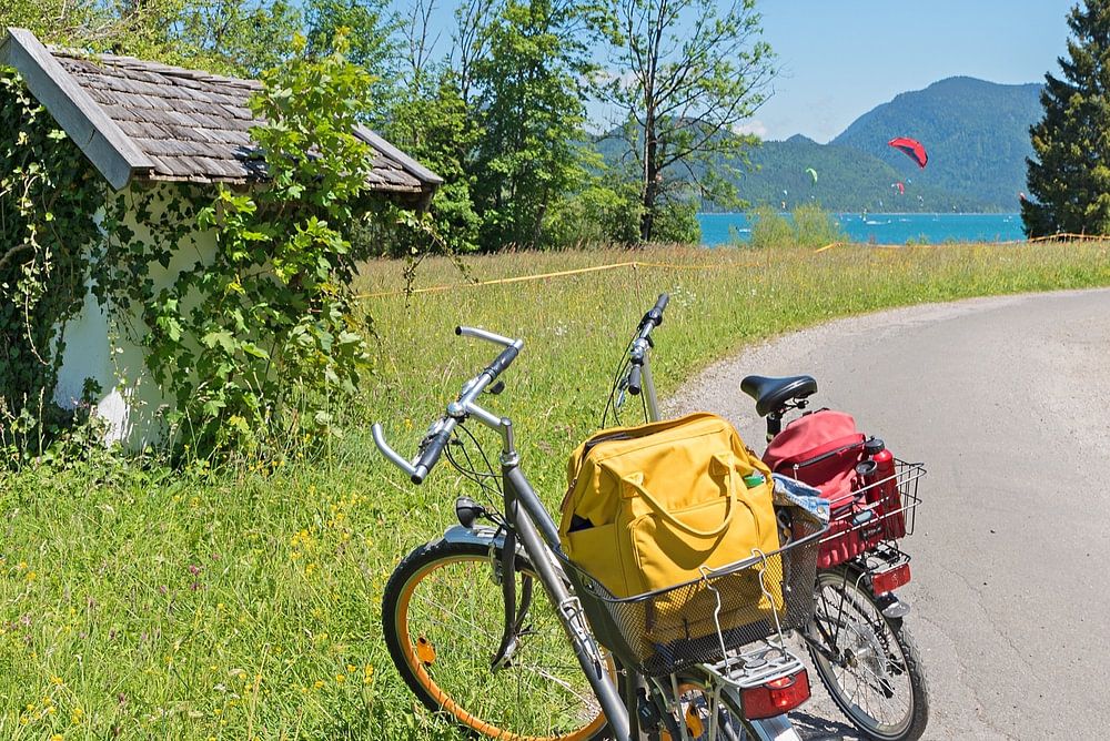Radtour um den Walchensee mit 2 Fahrrädern. landschaft in Oberbayern.
