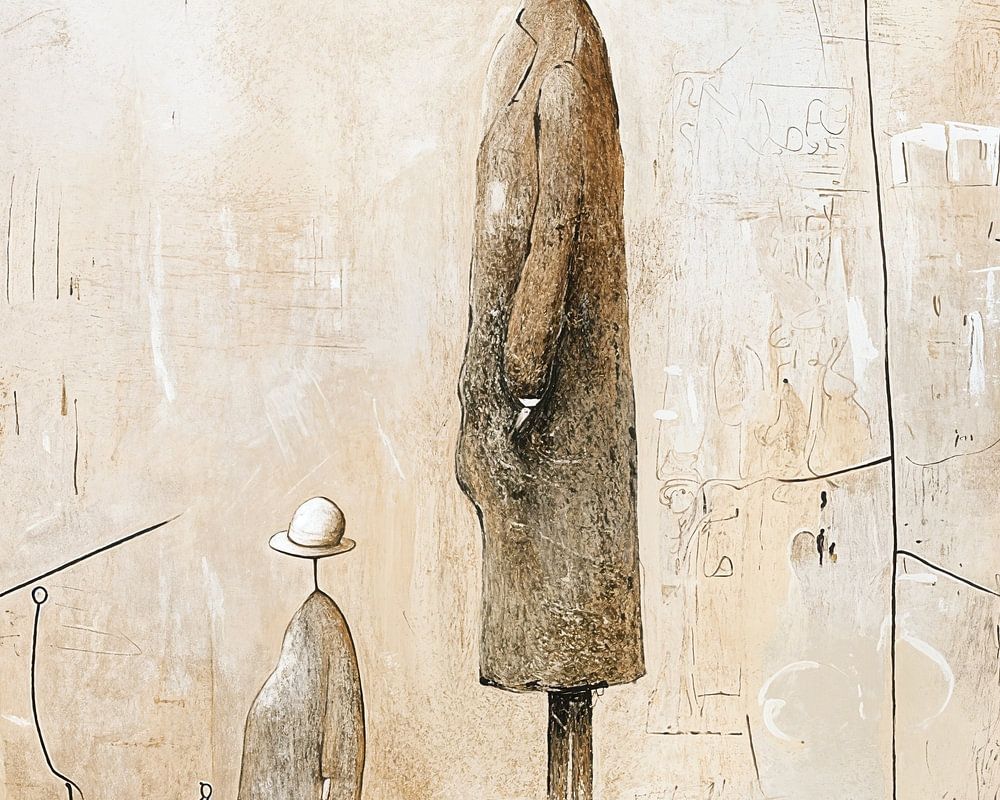 Raffinierte Erdtöne | Moderne Nostalgie - In einem außergewöhnlichen Spiel aus Textur und neutralen Tönen sehen wir ein raffiniertes Gleichgewicht zwischen Abstraktion und Figur. Gezeichnete Figuren, anmutig in ihren Proportionen und gekleidet in zeitlose Outfits, verleihen der Leinwand einen nostalgischen Reiz. Die Erdtöne und der weiche weiße Hintergrund bringen Ruhe und einen Hauch von Raffinesse in jedes Interieur.