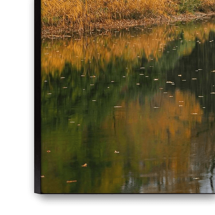 Das Foto zeigt den berühmten Steinbogen, der sich im stillen See spiegelt, umgeben von buntem Herbstlaub und weichem, diffusem Licht vom bedeckten Himmel.