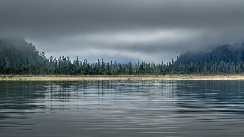 Das Foto zeigt einen weitläufigen kanadischen See mit sanft wogendem Wasser, einen Waldrand in der Ferne und darüber einen schwer bewölkten, bedrohlichen Himmel. Die Horizontlinie teilt das Bild fast in zwei gleiche Teile. Nebel oder tiefe Wolken hängen zwischen Bergflanken und Bäumen.