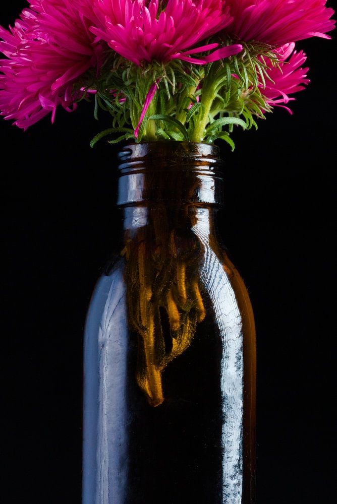 Raublatt Astern in brauner Flasche auf rotem Tischtuch und duklem Hintergrund