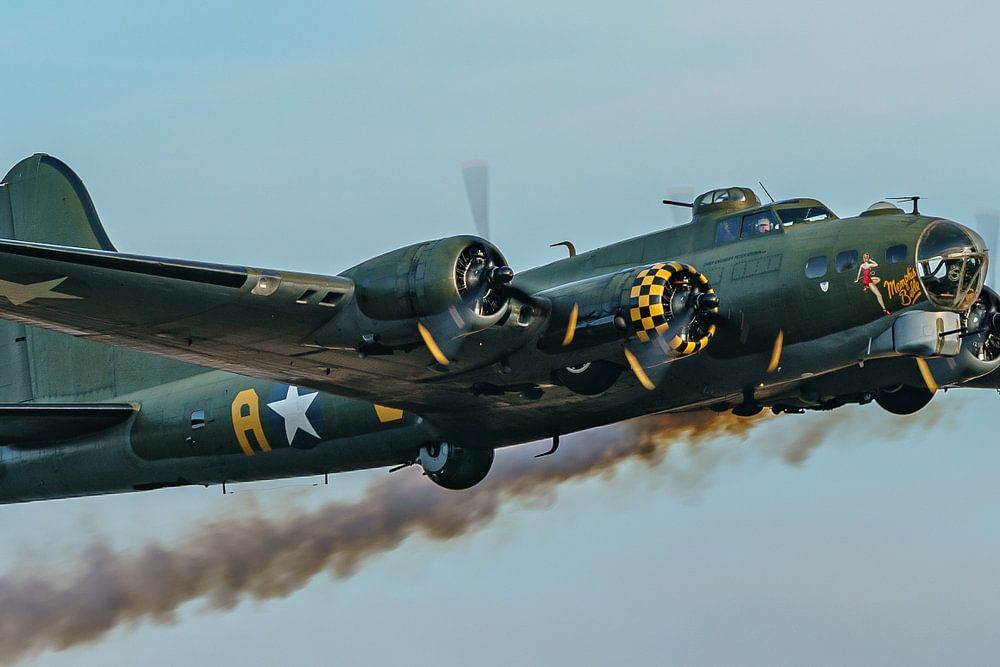Rauchende Boeing B-17G Flying Fortress "Memphis Belle".Flyby Boeing B-17G Flying Fortress "Memphis Belle" während der Sanicole Twilight Airshow.Boeing B-17 Memphis Belle / Sally B. ist die letzte, die noch in Europa fliegt. Eine kleine Anzahl dieser Bomber aus dem Zweiten Weltkrieg fliegt noch weltweit. Den Spitznamen "fliegende Festung" verdankt der viermotorige Bomber seiner Ausstattung mit dreizehn Maschinengewehren und einem Laderaum für bis zu 3.600 Kilo Bomben. Dieses Flugzeug hat die Memphis Belle Nose Art auf der rechten Vorderseite (siehe Foto) und Sally B auf der linken Vorderseite. Das Flugzeug ist im Besitz des Imperial War Museum in Duxford. Dieses Foto wurde am 13. September 2019 aufgenommen.