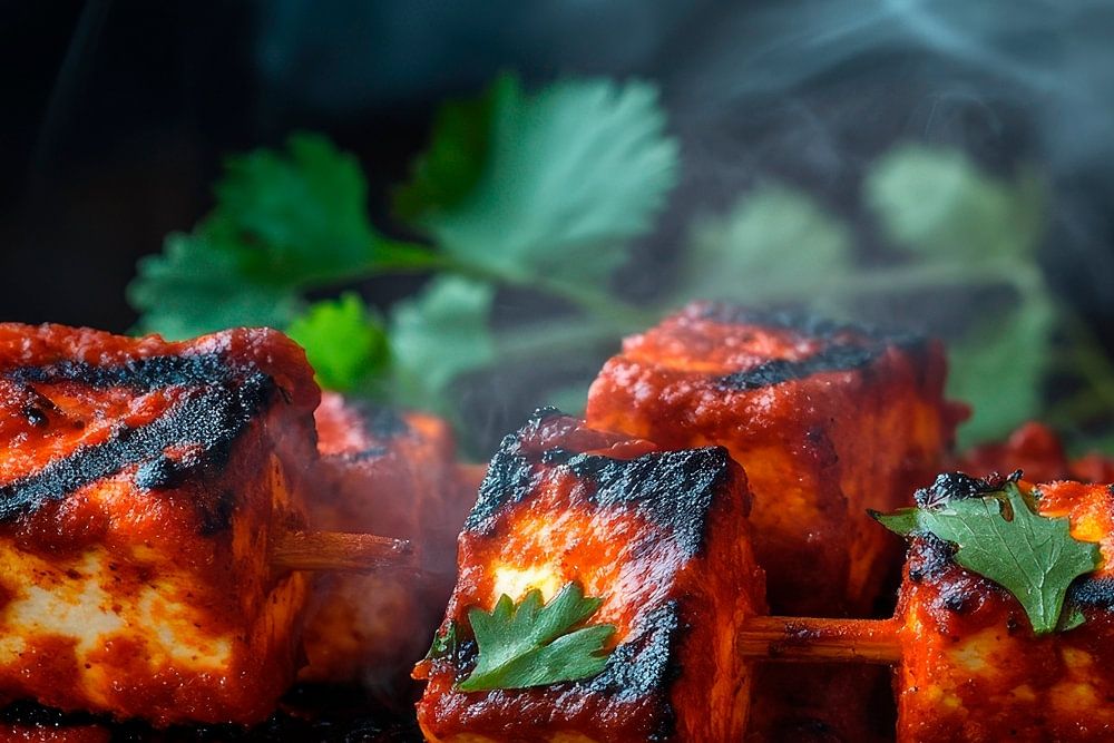 In einem verführerischen Spiel aus rauchigen Aromen und appetitlichen Farben entfalten sich saftige, gegrillte Margherita-Spieße, die mit grünen Korianderblättern geschmückt sind. Die dichte Rauchschicht umhüllt die exquisite Präsentation und weckt das Verlangen nach einem kulinarischen Abenteuer. Perfekt für die Küche, zaubert dieses Kunstwerk nicht nur Geschmack, sondern auch einladende Atmosphäre.