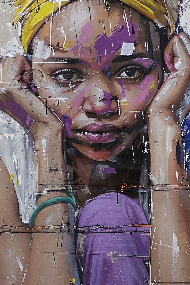 Dieses schöne Gemälde stellt eine afrikanische Frau in leuchtenden Farben und realistischem Stil dar. Ihr Gesichtsausdruck und ihre Pose strahlen sowohl Stärke als auch Verletzlichkeit aus und erzeugen eine tiefe emotionale Wirkung. Die Verwendung leuchtender Farben wie Gelb und Violett schafft ein dynamisches und visuell ansprechendes Kunstwerk, das jeden Raum aufhellen kann. Dieses Kunstwerk eignet sich perfekt für moderne Innenräume und fügt Ihrer Einrichtung ein einzigartiges, kulturell reiches Element hinzu. Es ist eine gute Wahl für alle, die ein auffälliges und bedeutungsvolles Kunstwerk suchen.