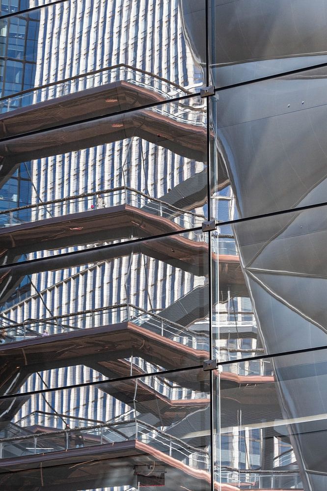 Eine faszinierende Spiegelung auf einer modernen Fassade, in der sich unter anderem „The Vessel“ verfängt. Durch die Verzerrung und das Zusammenspiel von Licht und Struktur entsteht ein abstrakter Blick auf die ikonische Architektur New Yorks - ein Spiel zwischen Realität und Illusion.