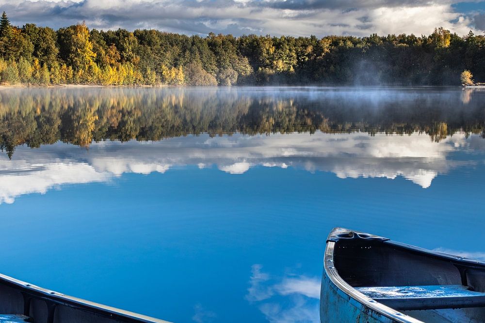 Eine friedliche Herbstlandschaft in Drenthe, zwei Kanus liegen nebeneinander im Wasser, Bäume und Wolken spiegeln sich im Wasser. Die Bäume stehen in herbstlicher Pracht, man könnte meinen, das Foto wurde im Ausland aufgenommen, aber die Aufnahme entstand in Drenthe