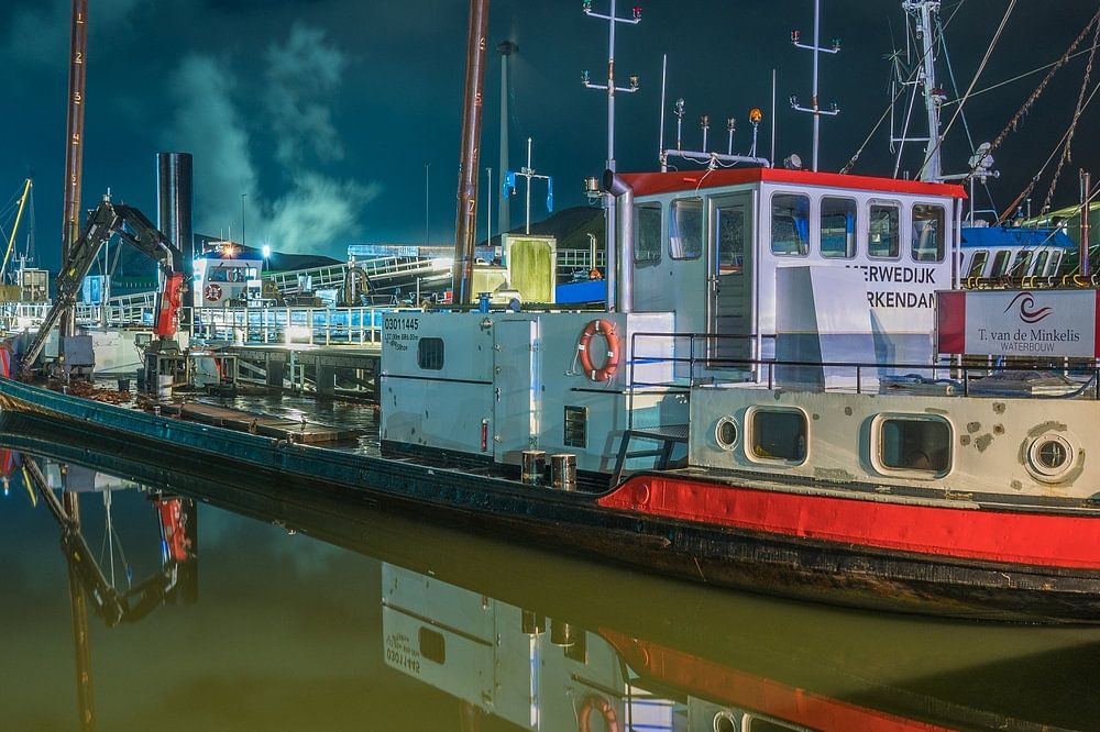 Arbeitsschiff Merwedijk am Anleger in Eemshaven mit einer schönen Reflexion im spiegelglatten Wasser. Am dunklen Himmel sind die Rauchfahnen des RWE-Kraftwerks zu sehen. Der Schlepper Waterstroom von Wagenborg liegt ebenfalls am Kai und spiegelt sich schön im Wasser.