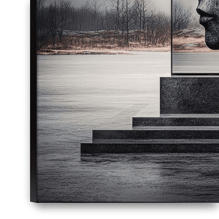 Diese monumentale Skulptur erhebt sich aus einer stillen, fast entrückten Landschaft – ein futuristisches Denkmal zwischen Vergänglichkeit und Zeitlosigkeit. Der Kopf aus dunklem Stein wirkt roh und zugleich kunstvoll geformt, ein Relikt aus einer Epoche, die weder Vergangenheit noch Zukunft zuzuordnen ist. Durch das transparente…