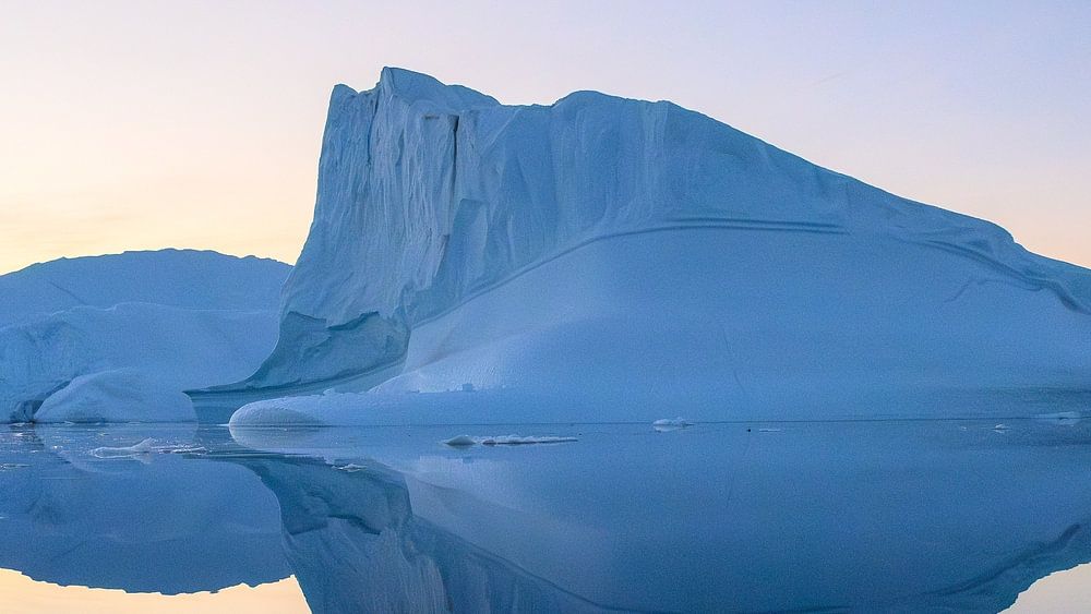 Während der blauen Stunde in Icebergcity in einem Zodiac zwischen den Eisbergen. Es ist unwirklich, zwischen ihnen zu segeln. Das Wasser ist ruhig, aber man kann die Eisberge knacken, reißen und knallen hören.
