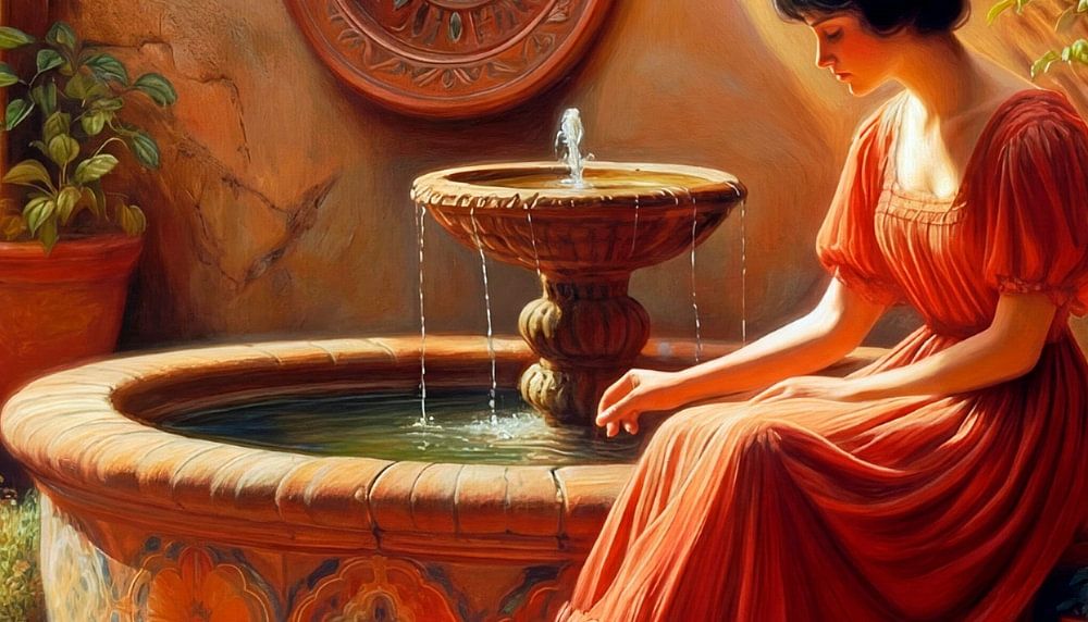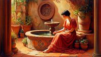 Genau wie „Im Schatten“ ist auch dieses Werk von den Arbeiten John William Godwards inspiriert. Er ließ seine Modelle jedoch in durchsichtigen Gewändern posieren, und wenn sie am Brunnen lagen, dann meist auf einem Tierfell. Diese junge Frau im roten Kleid posiert nicht, sondern ist in Gedanken versunken an einem Terrakotta-Brunnen an…