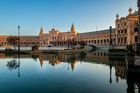 Das warme Licht Sevillas spiegelt sich im stillen Wasser der Plaza de España. Eine Harmonie aus Architektur, Ruhe und goldenen Farbtönen, die sich zu einem zeitlosen Bild vereinen.