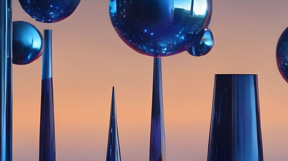Dieses Kunstwerk ist eine moderne Ode an die Schönheit der geometrischen Abstraktion. Glänzende kugelförmige Objekte und stromlinienförmige Säulen bilden eine futuristische Landschaft vor einem warmen, leuchtenden Horizont. Die spiegelnden Oberflächen und die präzise Platzierung der Objekte ergeben eine Komposition, die für die minimalistische Kunst charakteristisch ist, während die digitale Wiedergabe und die Verwendung von Licht und Schatten eine zeitgenössische Wendung hinzufügen, die zur Bewegung der Digitalen Kunst passt. Dieses Werk wäre ein Prunkstück in einem modernen Wohn- oder Büroraum, ideal für Sammler, die von der Verschmelzung von Technologie und Kunst fasziniert sind.