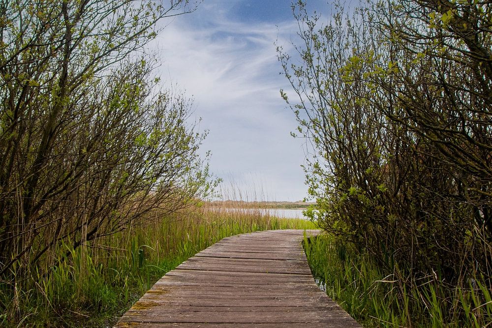 Ein Bohlenweg, fotografiert auf Ameland. Wenn Sie diesen Weg entlanggehen, gelangen Sie zu einem Vogelschutzgebiet mit Blick auf einen See.