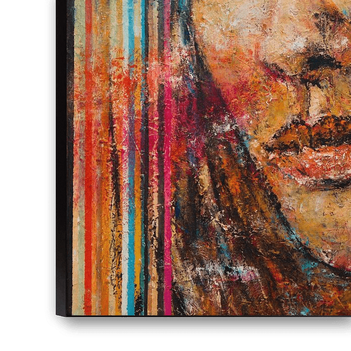 Dieses Kunstwerk besteht aus vielen Schichten. Die schöne Frau mit den umwerfend blauen Augen spielt die Hauptrolle. Ihr Gesicht geht über in eine Reihe von Streifen und Farben. Die Regenbogenfarben spielen eine Hauptrolle.