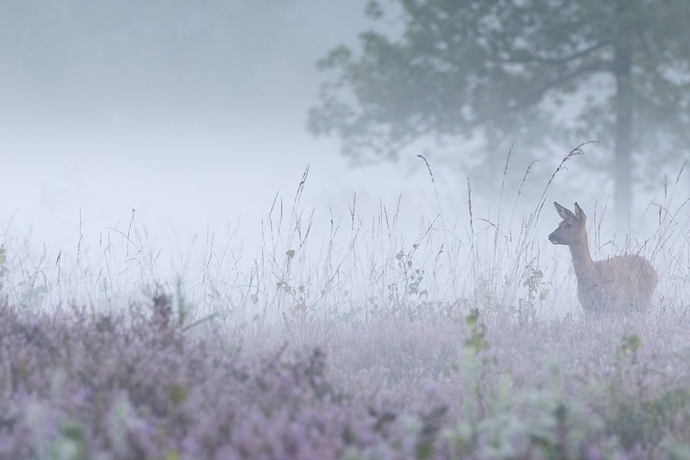 Es scheint, als ob die Zeit für einen Moment stillsteht. Und dann, wenn man genau hinschaut, sieht man ein Reh. Es taucht aus dem Nebel auf, elegant und schweigsam, mit sanften Augen, die ihre Umgebung genau beobachten. Es ist eines der vielen verborgenen Wunder, die das Moor am frühen Morgen beherbergt.