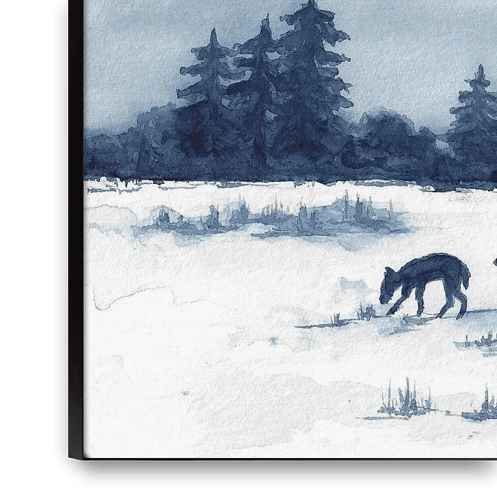Diese Aquarellmalerei ist mit nur einer einzigen Farbe, dem Indigoblau, gemalt. Es zeigt eine Rehfamilie im Winter, Im Hintergrund fliegt ein Falke, zwei Tauben sind von den Tannen erschreckt aufgeflogen