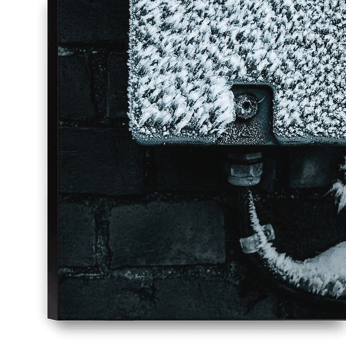Eine vereiste Metallbox ist mit dichten Reifstrukturen überzogen und hebt sich klar von einer dunklen Backsteinwand ab. Kühles Blaugrün und markante Kristalltexturen ergeben ein minimalistisches, grafisches Wintermotiv. Perfekt als…