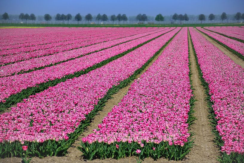 Endlose Reihen voller rosa Tulpen auf einem großen Feld am Schollevaarweg in der Nähe der Stadt Zeewolde in Flevoland, Niederlande.