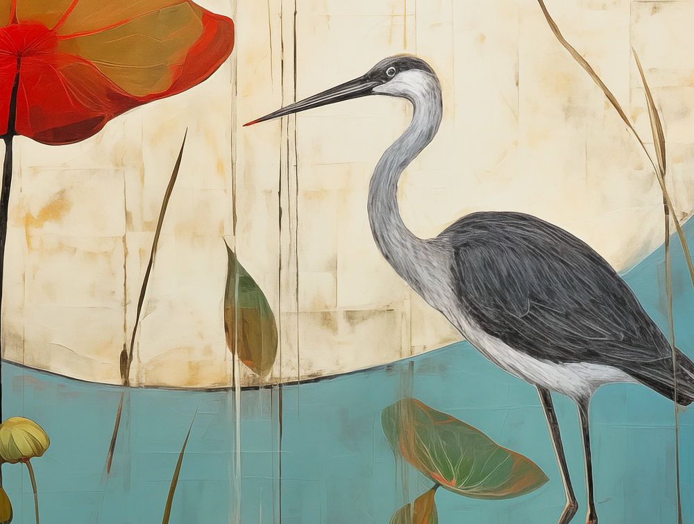 Anmutig und graziös. Der Reiher auf seinen hohen Beinen im Wasser. Reflexion auf dem Wasser. in japanischen Atmosphären