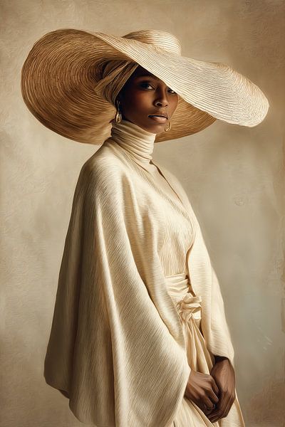 Eine subtile Eleganz: Eine elegante Frau in cremefarbenem Leinenkleid posiert unter einem imposanten Strohhut. Das Kunstwerk spielt mit Kontrasten und Proportionen – die geometrische Kühnheit des Hutes bildet einen wunderschönen Kontrast zur zurückhaltenden Eleganz ihrer Silhouette. Die warmen, gedeckten Farbtöne und die klassische Pose…