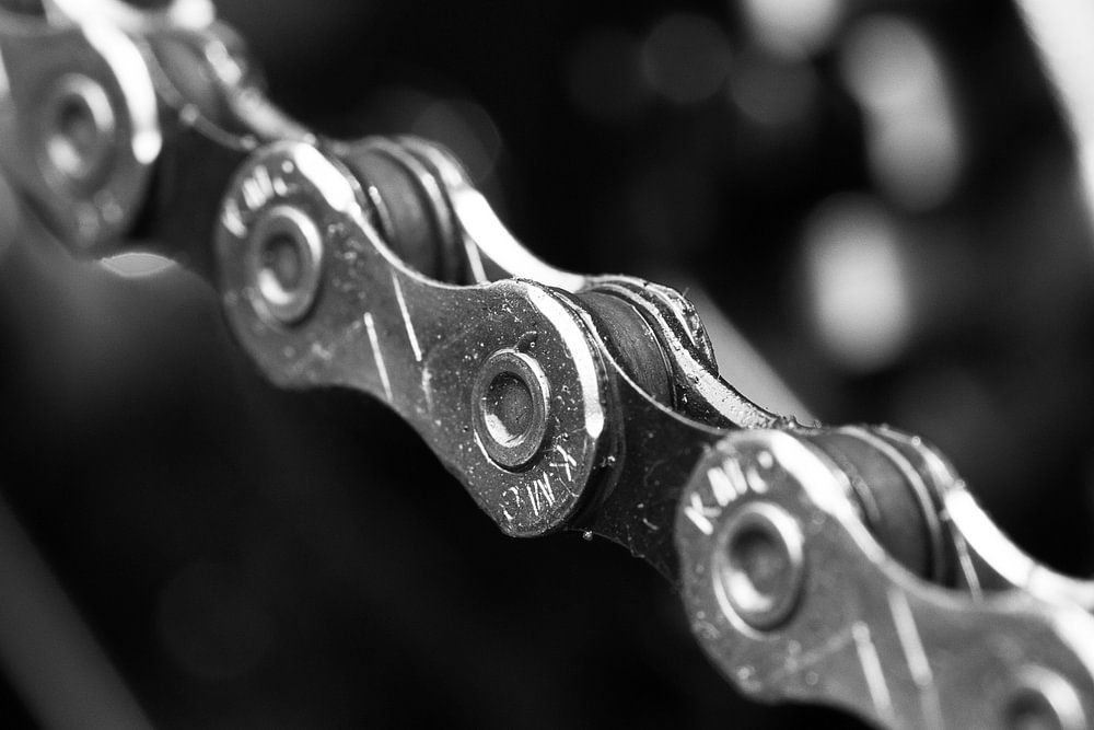 Ein Rennrad, das im Detail fotografiert wurde. In schwarz-weiß, um die Details deutlich zu zeigen.