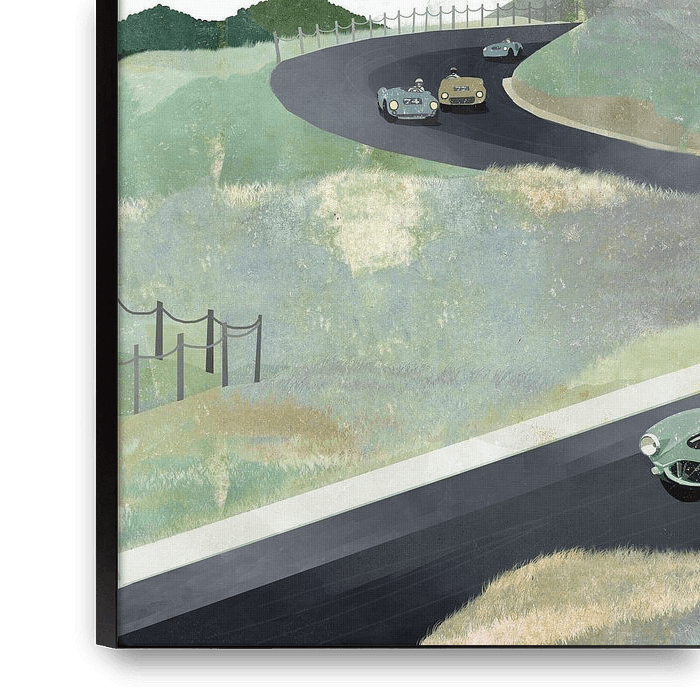 Abbildung der Rennstrecke in Zandvoort zwischen den Dünen, mit Oldtimer-Rennwagen.
