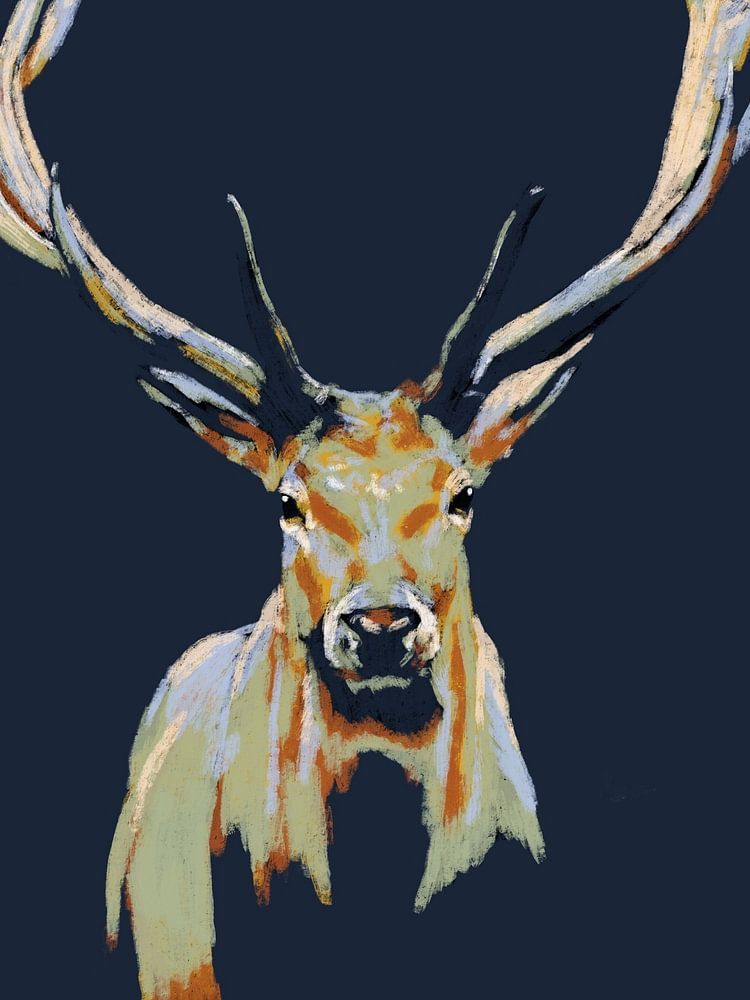 Ein kräftiges Rentier mit großem Geweih mitten in der Nacht. Eine farbenfrohe Version mit Grün, Rot und sanften Pastelltönen wie Rosa und Blau. Der kraftvolle Blick des Tieres fesselt sofort die Aufmerksamkeit und zieht den Betrachter weiter in das Bild hinein.