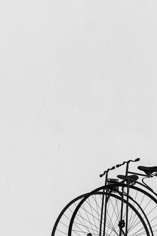 Schwarz-Weiß-Foto eines Retro-Fahrrads mit einem großen Vorderrad.