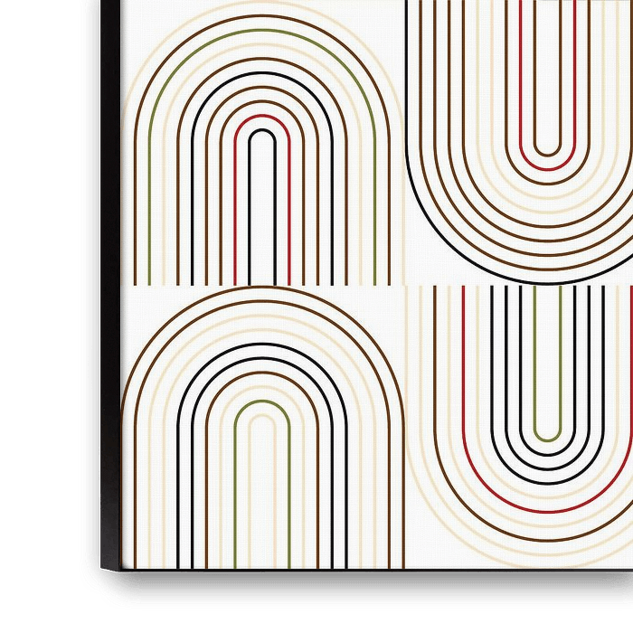 Modernes abstraktes geometrisches Kunstwerk mit Kreisen, Halbkreisen und Linien im Retro-Bauhaus-Stil.