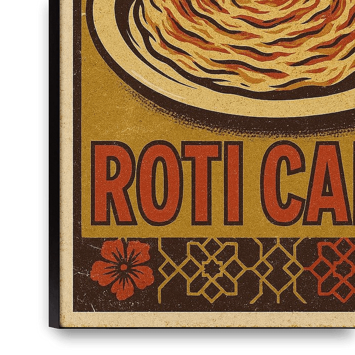 Feiern Sie das Herzstück des malaysischen Frühstücks mit diesem Retro-Roti-Canai-Poster, einem vom Vintage-Stil inspirierten Kunstwerk, das eines der beliebtesten Gerichte Malaysias in Szene setzt. Roti Canai, ein flockiges, knuspriges und weiches Fladenbrot, wird oft mit Dhal-Curry oder würzigem Sambal gegessen und ist ein beliebtes…