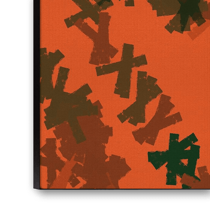 Dieses abstrakte, minimalistische Kunstwerk konzentriert sich auf ausdrucksstarke Pinselstriche in Braun, Oliv, Tarngrün und leuchtendem Orange-Terrakotta. Die Farbpalette vermittelt ein klares Retro-Gefühl: warme, leicht nostalgische Farben, die an das Design der 70er Jahre erinnern, aber dennoch modern und lebendig wirken. Die…