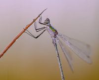 Nahaufnahme von der Seite einer Schmeißfliege, wobei ihr Rücken vollständig mit Tautropfen bedeckt ist