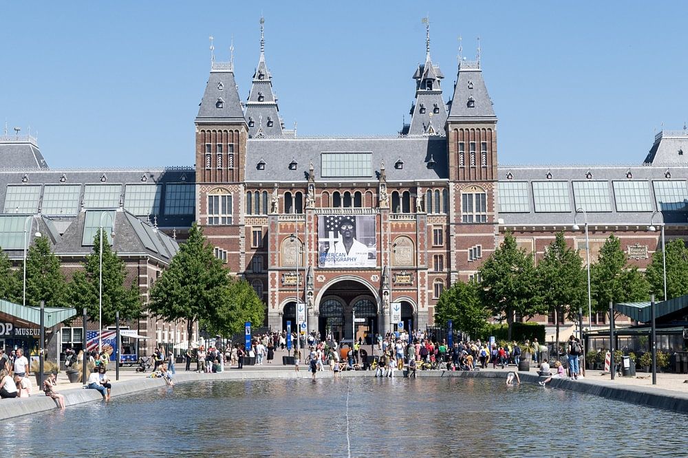 Amsterdam Niederlande Rijksmuseum auf dem Museumplein an einem sonnigen Frühlingstag. teich, teich,