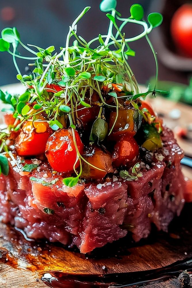 Eine appetitliche Komposition aus frischem Hackfleisch, garniert mit leuchtend roten Kirschtomaten und zarten Kräutern, zieht sofort die Blicke an. Der natürliche Holzuntergrund verstärkt den rustikalen Charme und vermittelt ein Gefühl von Genuss und Handwerkskunst. Ideal für die Küche oder das Esszimmer, wo es kulinarische Atmosphäre verbreitet und den Gaumen zum Verweilen einlädt.